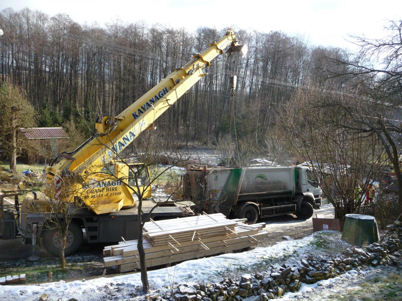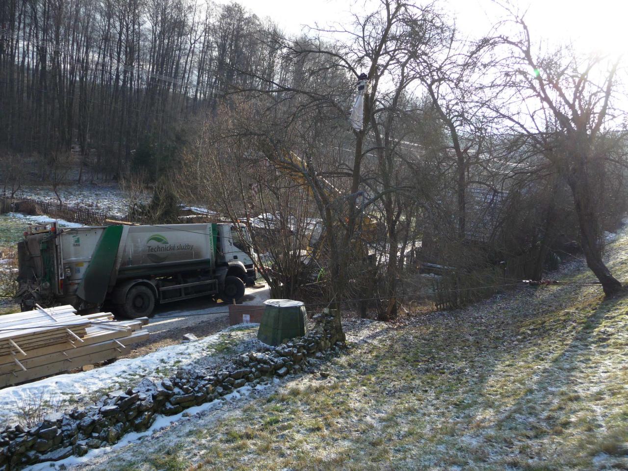 Nehoda nákladního auta (NA) na svoz tuhého komunálního odpadu (TKO) u domu č.p.8 dne 25.1.2021 a jeho vyproštění.