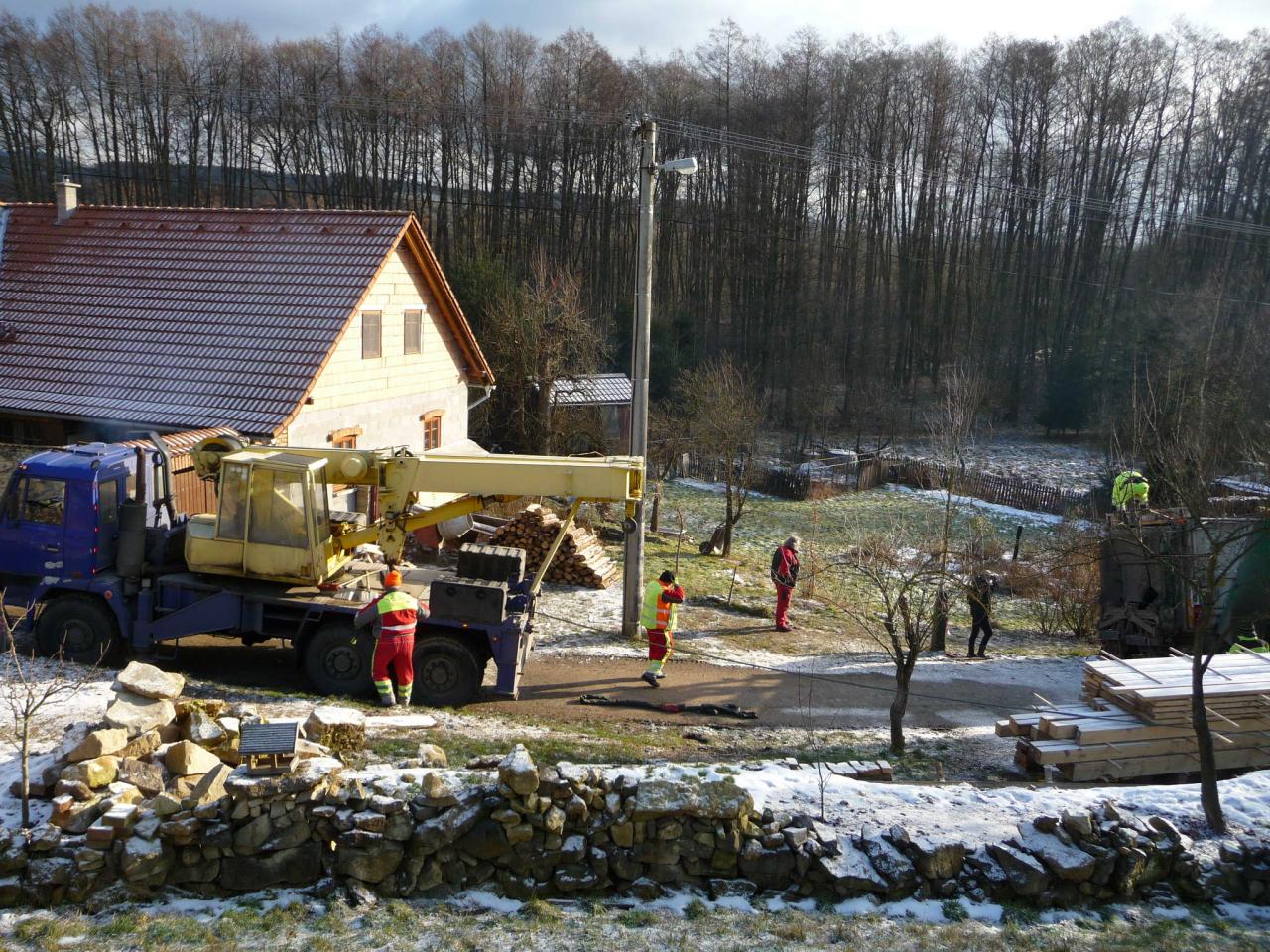 Nehoda nákladního auta (NA) na svoz tuhého komunálního odpadu (TKO) u domu č.p.8 dne 25.1.2021 a jeho vyproštění.