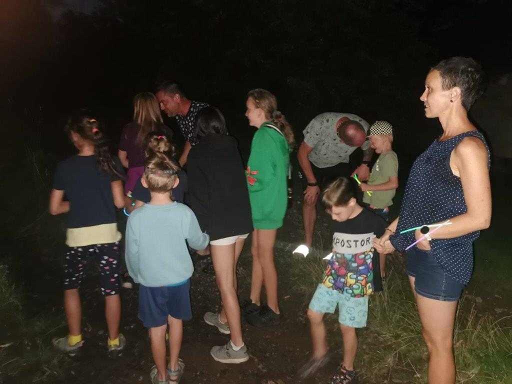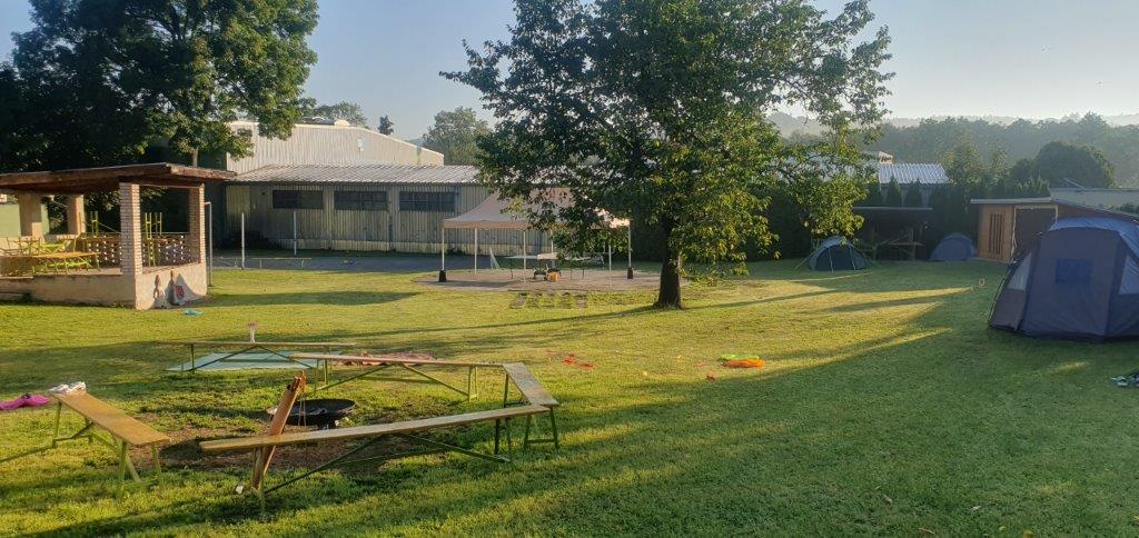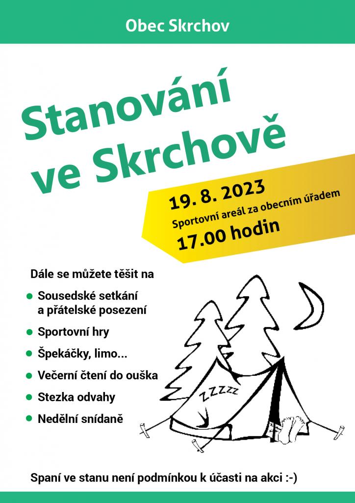Stanování proběhlo v poklidné letní atmosféře na zahradě za obecním úřadem. Zejména pro malé návštěvníky bylo připraveno několik sportovních her a v neposlední řadě večerní "Čtení do ouška", četby se ujala paní knihovnice a malé posluchače nebylo možné od čtení odtrhnout. Po setmění se děti vydaly na stezku odvahy z prvotního nadšení jednotlivců, se nakonec vytvořili skupinky, které pod dohledem dospělých zdolaly nástrahy nočního Skrchova (téměř všechny děti si stezku odvahy zopakovaly :-) Pro dospěláky bylo připraveno občerstvení a tradiční sousedské setkání. ranní vstávání všem zpříjemnila snídaně, uvařená přímo na místě. Dopoledno v areálu proběhlo ještě několik herních a sportovních výkonů.